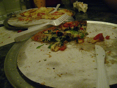 The pizzas are kind of small, just bigger than personal size, so the seven of us shared six pizzas. Sadly, we forgot to take pictures until almost all of the pies were gone. So you'll have to use your imagination with this one piece: